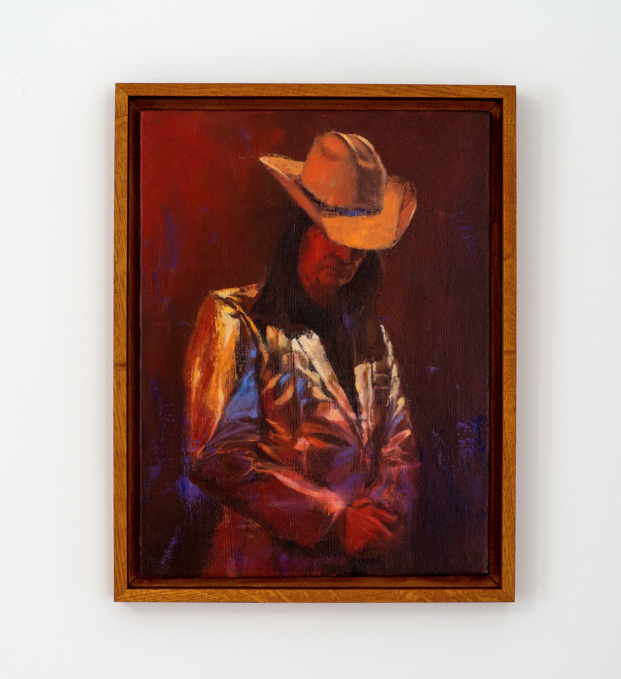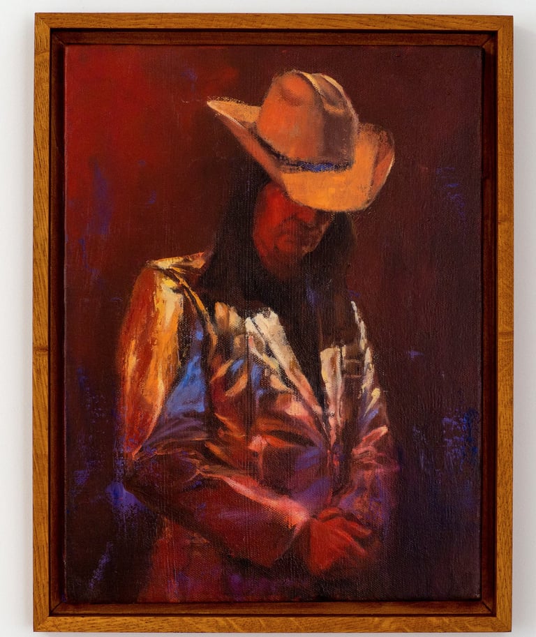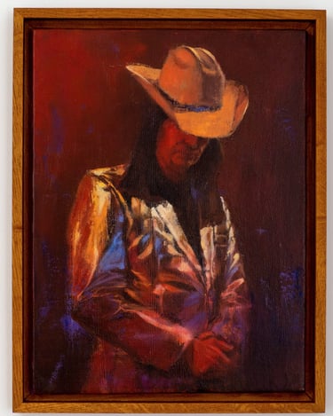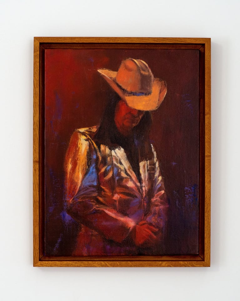 This painting captures a singer on stage, draped in a reflective, ostentatious outfit reminiscent of an American showman or space cowboy. The subject, inspired by the lead singer of Laibach, stood motionless in a moment of solitude, as though detached from the grand audience before him. His stillness evoked an intimate vulnerability, as if he had momentarily forgotten the act of performance, lost in his own thoughts.