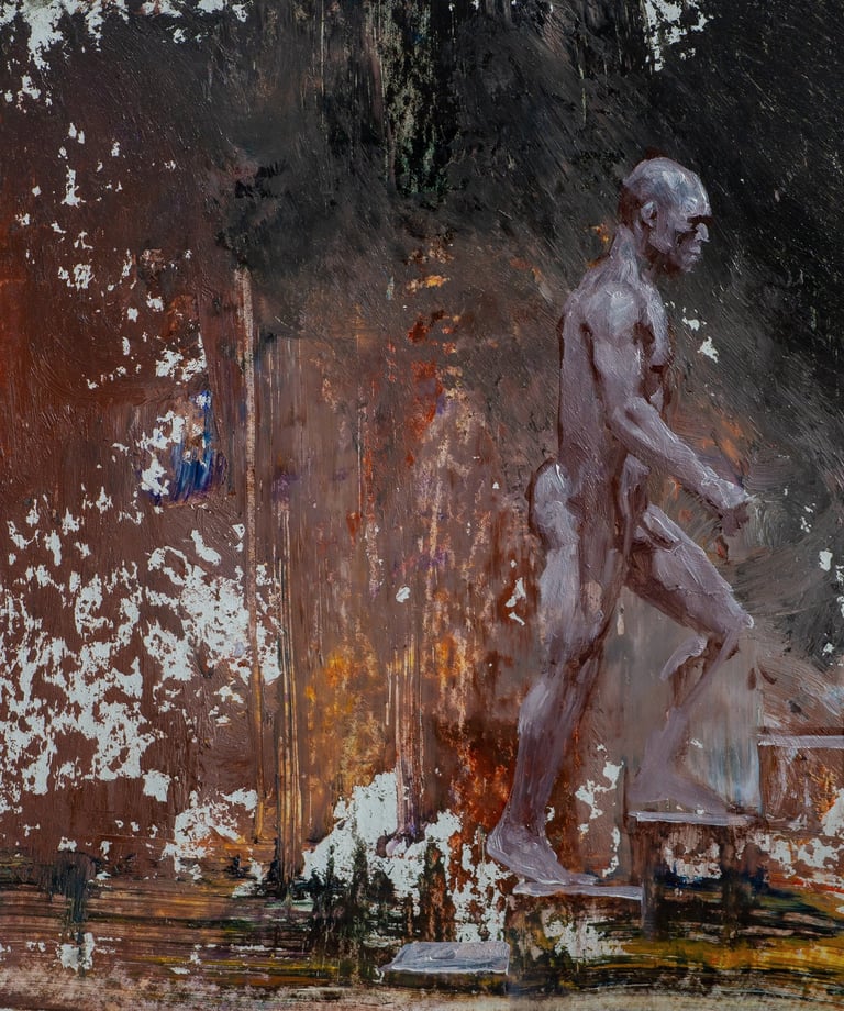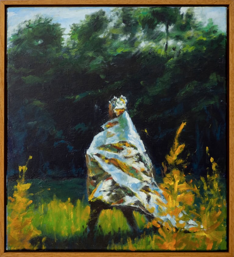 This painting portrays a figure wrapped in a foil blanket, often used to save lives, suggesting a recent escape from a critical situation. The foil forms a makeshift crown atop the figure's head, symbolizing an ironic sense of triumph. Having just escaped, the figure already assumes the role of the king of his environment, highlighting the absurdity of immediate self-aggrandizement.